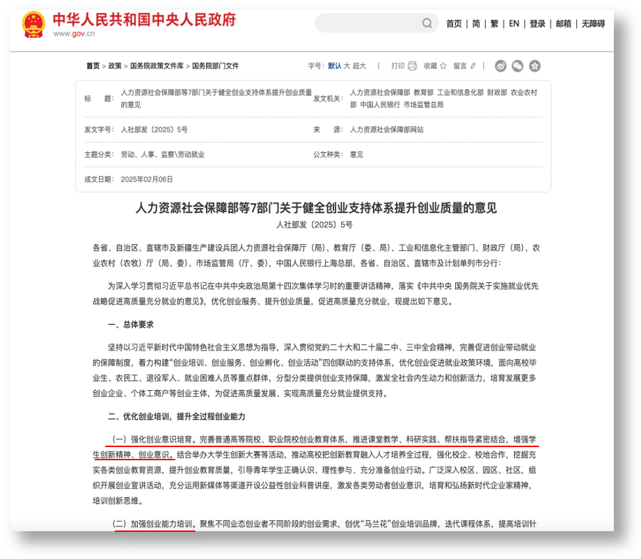 当前国内政策大力支持大学生创新创业能力培养。2025年2月,人力资源社会保障部等7部门发布《关于健全创业支持体系提升创业质量的意见》¹,其中提出要完善普通高等院校、职业院校创业教育体系,推进课堂教学、科研实践、帮扶指导紧密结合,增强学生创新精神、创业意识。结合举办大学生创新大赛等活动,推动高校把创新教育融入人才培养全过程,强化校企、校地合作挖掘充实各类创业教育资源,提升创业教育质量。