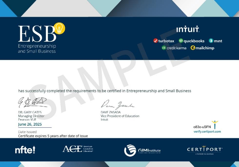 ESB创业与小型企业管理认证由培生旗下Certiport联合Intuit以及全球创业教学网络(Network for Teaching Entrepreneurship,NFTE)权威打造,构建了标准化的创业素养评估框架,致力于赋能未来商业领袖,使其在当下激烈的竞争环境里,能够凭借所学知识与技能脱颖而出、迈向成功。