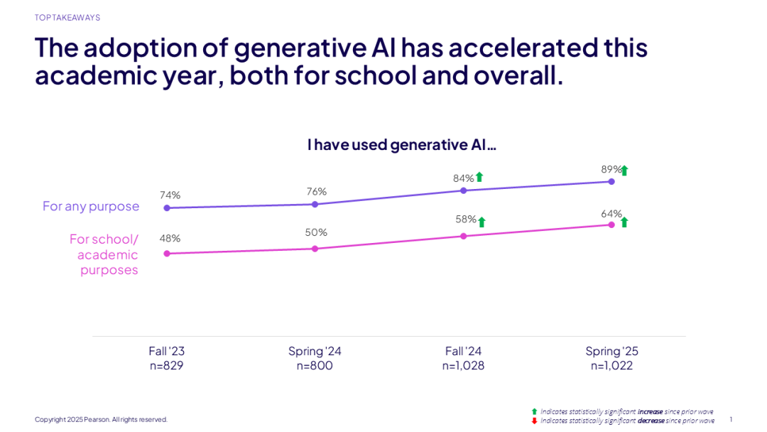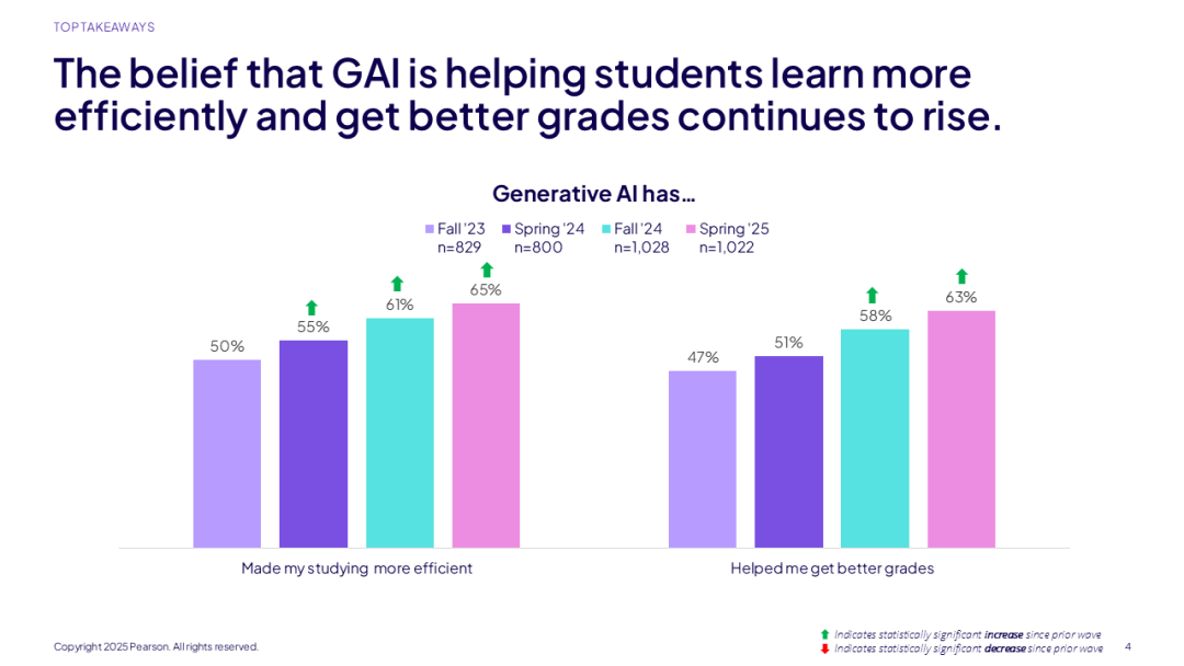 超过半数的学生(53%)现在更倾向于使用融合了AI的学习工具——和2024年秋季学期相比,这一比例有显著提升。这种偏好的背后是学生对AI的信心在日益增加:近三分之二的学生认为AI使学习更高效,也更有成效。