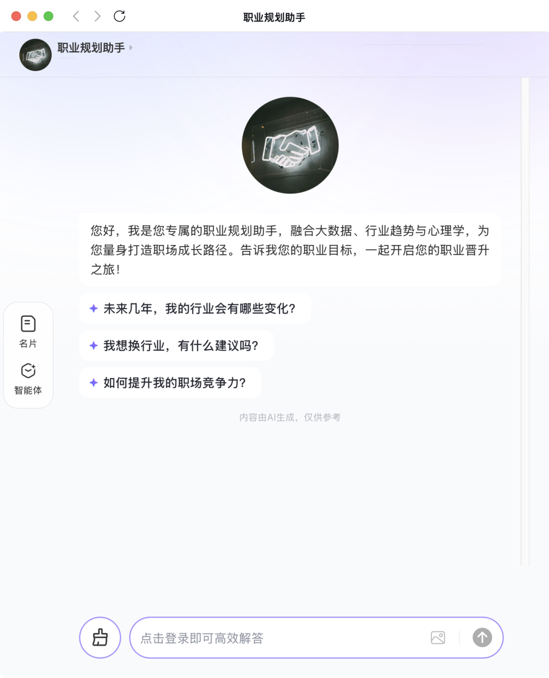 借助 “启发式对话” 模式开展 AI 教练式咨询服务,引导用户自主决策,着重培养用户独立的职业判断能力。