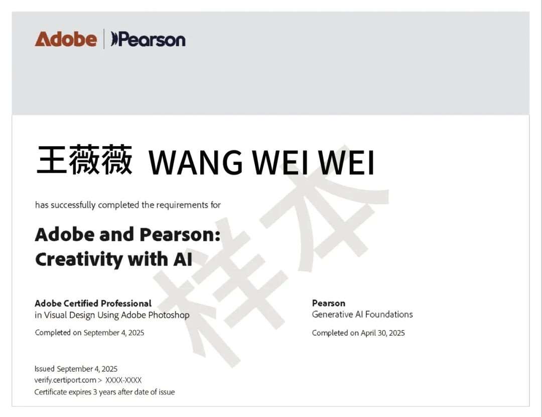 完成双认证后,你将收获由Adobe与培生联合颁发的“AI赋能创意”专项资质——它不仅是对“能把专业设计能力与前沿AI工具深度融合,实现‘更智能、更高效、更具想象力’创作”的认可,更是向行业宣告:你不只是在“跟上AI浪潮”,更是在“引领创意未来”。